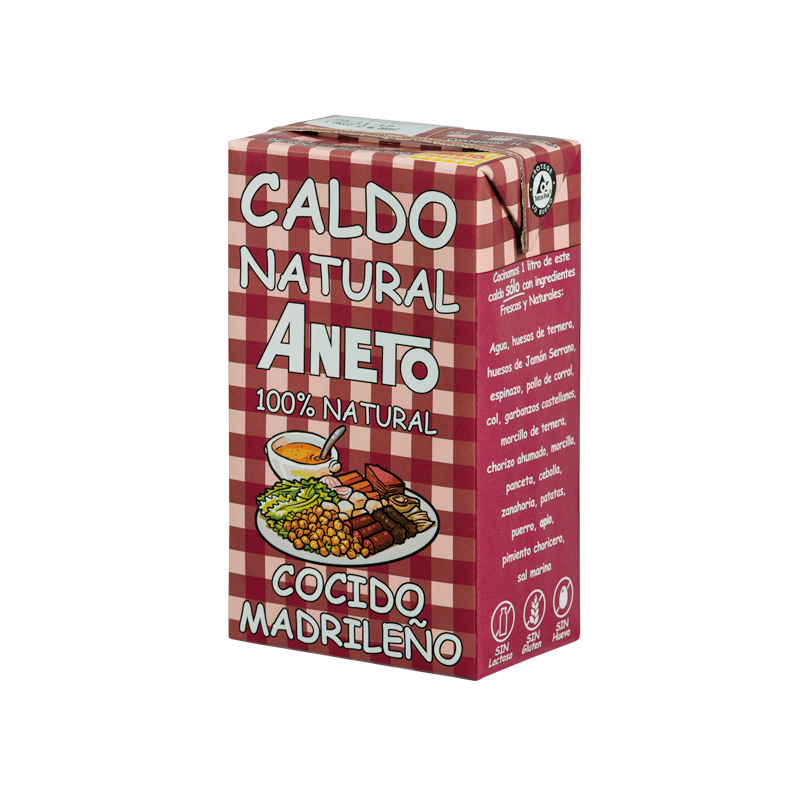 Ingrédients : eau, os de veau, os de jambon Serrano, os dorsal de porc, poulet élevé au sol, chou, pois chiches, boudin de veau, chorizo fumé, boudin, lard, oignon, carotte, pommes de terre, poireau, céleri, poivron choricero et sel marin.