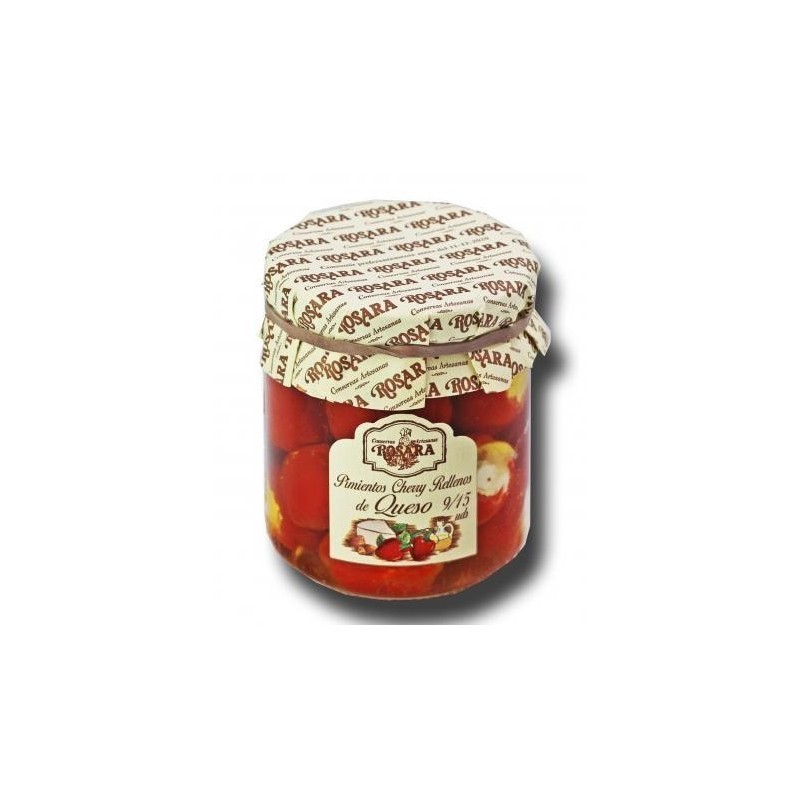 Poivrons cherry farcis au fromage frais de lait de vache, conservés dans de l'huile d'olive.